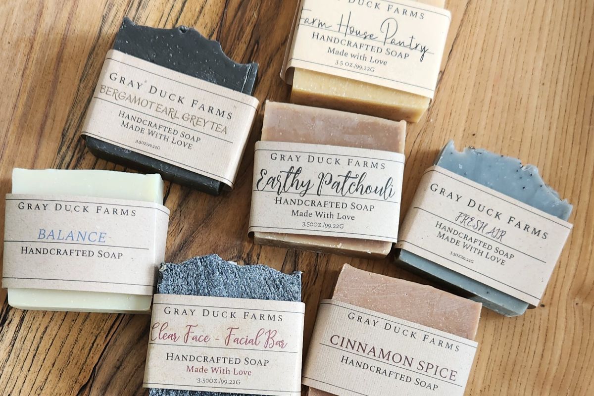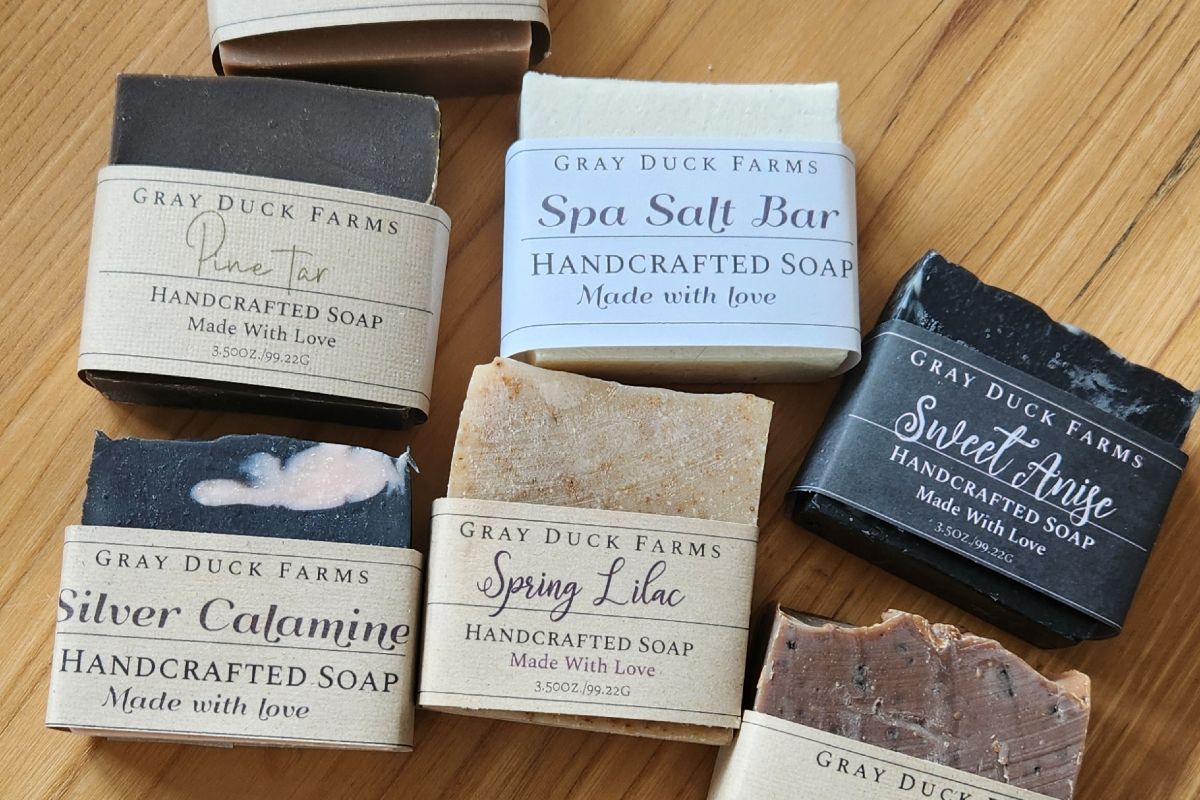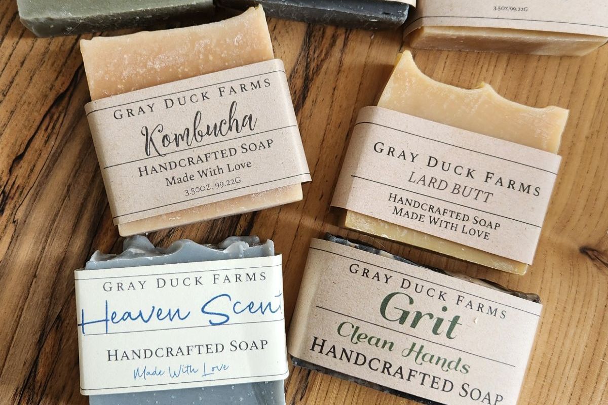 Ingredients: lard, raw milk, sodium hydroxide, coconut oil, olive oil, castor oil, duck eggs, honey, oatmeal, and sea salt