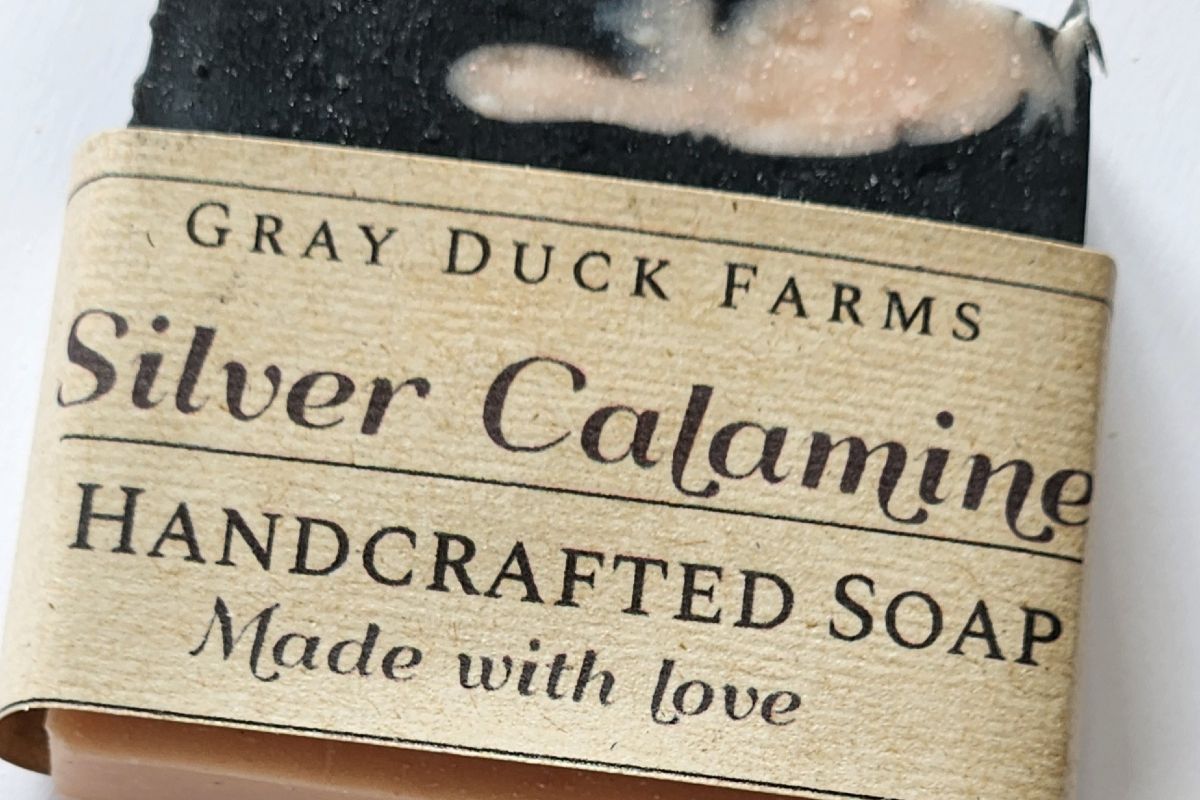 Ingredients: lard, ionic silver water, olive oil, coconut oil, sodium hydroxide, castor oil, calamine powder, and charcoal
