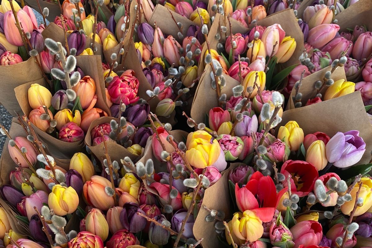 About 10 tulips and 5 stems of pussy willow. Please note that colors/types of tulips may vary from what is pictured depending on availability