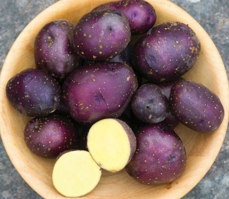 Harvest Moon potatoes - This mid-season potato (85-100 days) has round tubers with alluring dark purple skin and deep yellow flesh. Firm texture after cooking. Great for roasting, baking, soups and chips. Excellent storability. They're also a rich source of dietary fiber, magnesium, potassium, and antioxidants, including anthocyanin and carotenoids.