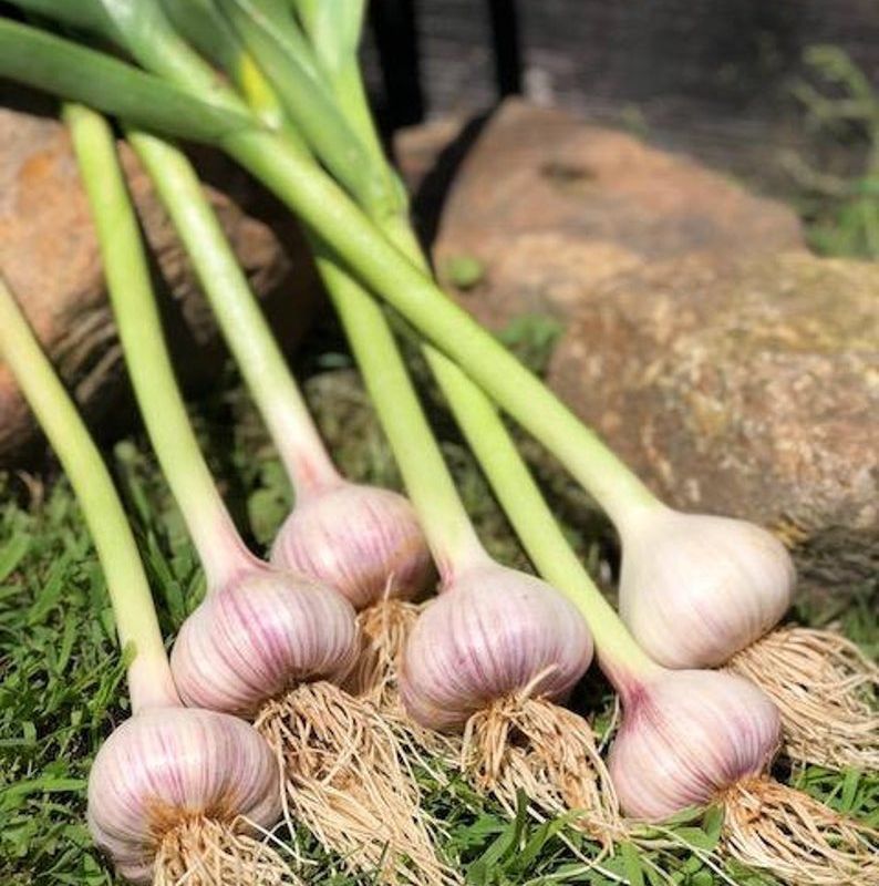 Has a good lingering taste and retains flavor well when cooked. Its beautiful purple-striped paper, cloaking red cloves, is quite easy to peel. Hardneck, 8-10 cloves per bulb.