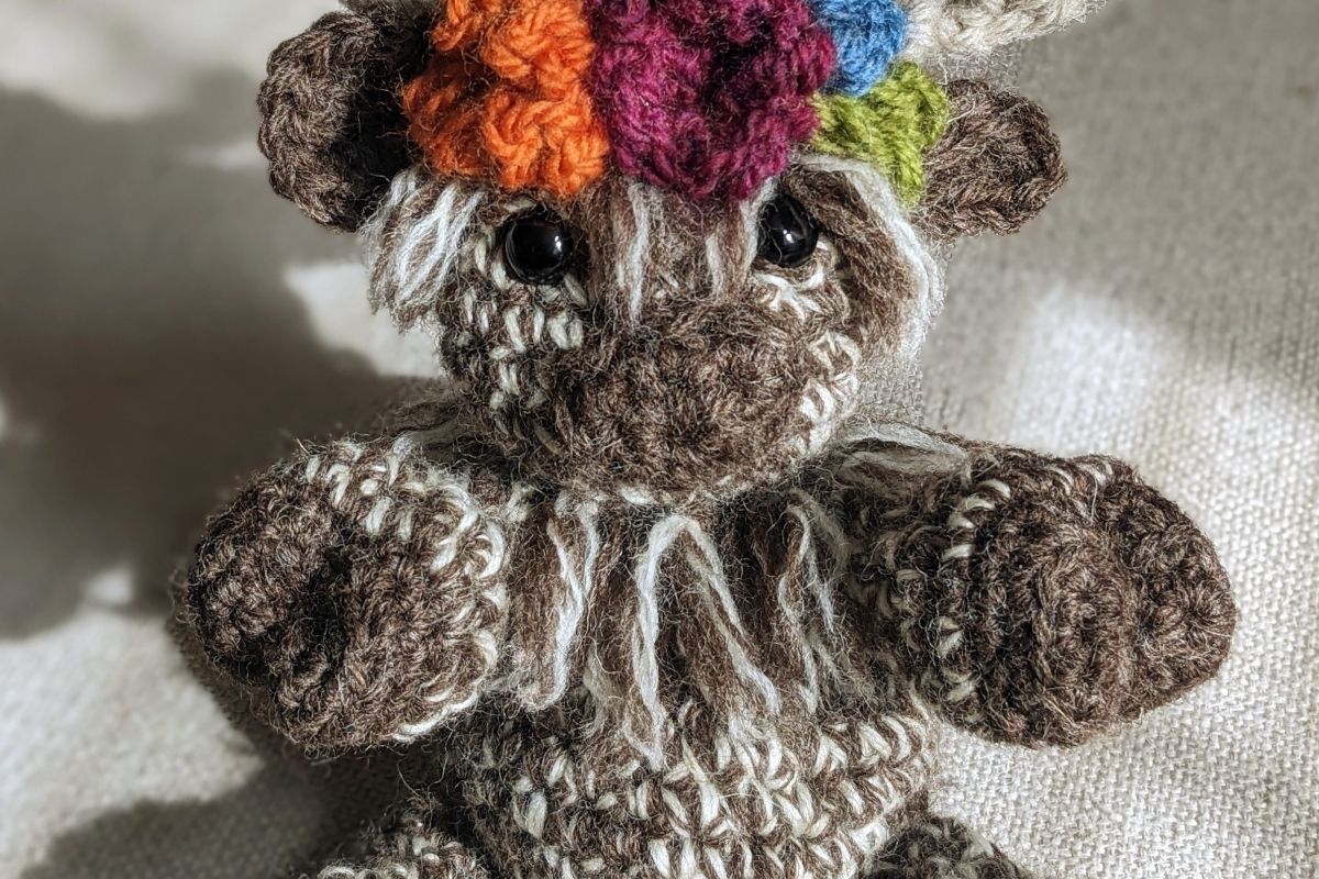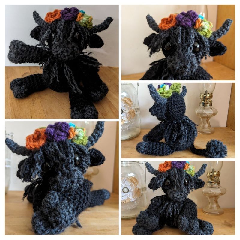 These little adorable guys are made with 100% Wool yarn, and sit at just over 5" tall. They are crocheted, and feature a beautiful floral crown, and that classic highland shag. Spot clean only. Inner is polyfil. Plastic safety eyes were used.