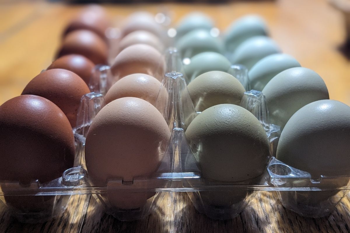 We have almost always had at least a few hens on our farm, and last year we hatched out multiple batches to give us lovely olive and easter egger hens that are now laying beautifully for us. No, we cannot guarantee our feed is organic or nonGMO. However our hens are “Pasture Raised” and roam freely all over our farm and only a portion of their diet is the feed we supplement. They have a regular healthy diet of bugs and vegetation, as well as eating scraps from our families table (Yep…that includes our grassfed beef!), and during molt they are given the leftovers of all our bone broth batches.