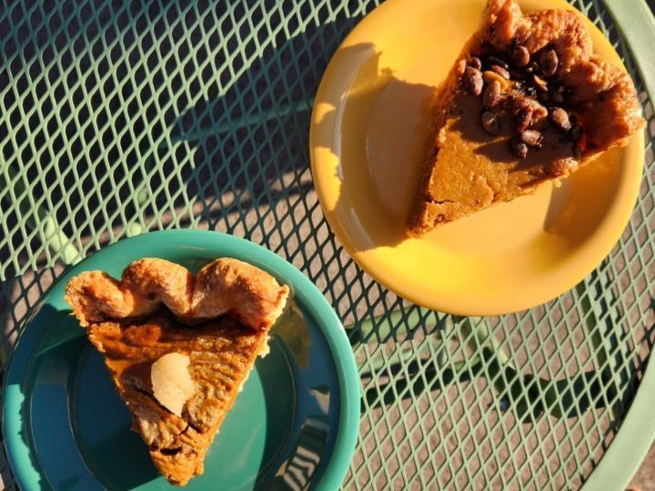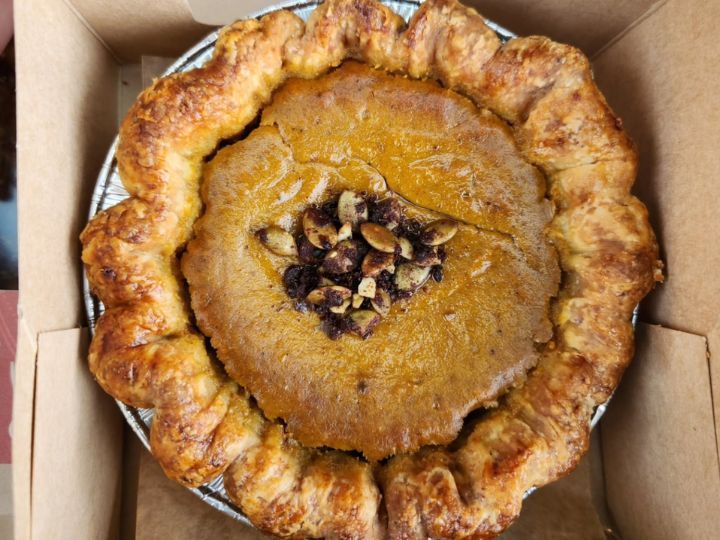 - Pumpkin Maple Pie "Local pie pumpkin varieties, roasted and blended with Maple Leaf Sugaring maple syrup and warm spices, topped with our toasty pepita black sesame crunch in our all-butter crust."