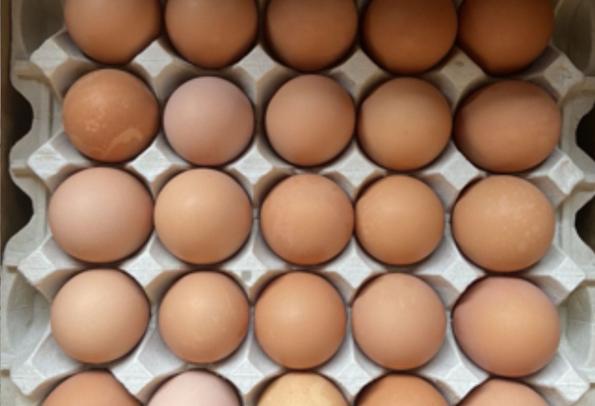 Eggs from our hens who roam free on pasture. Grade A Large, mostly brown eggs with an occasional heritage light blue egg mixed in thanks to our Araucana hens. Beautiful, nutritious gold yolks.