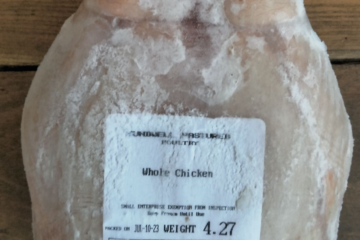 A whole chicken produced by Yundwell Pastured Poultry in Canaan, NY. Yundwell raises their poultry on pasture and practices rotational grazing. Yundwell chickens are raised according to the strictest production and humane treatment standards.