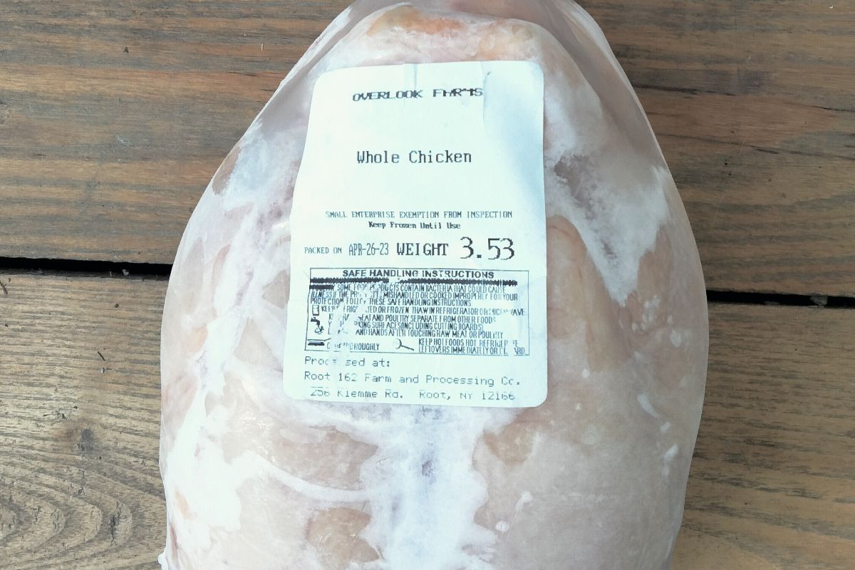 A whole chicken produced by Overlook Farms in East Chatham, NY. Overlook raises their poultry on pasture, practices rotational grazing, and is committed to regenerative agriculture and never treating their animals with antibiotics or growth hormone.