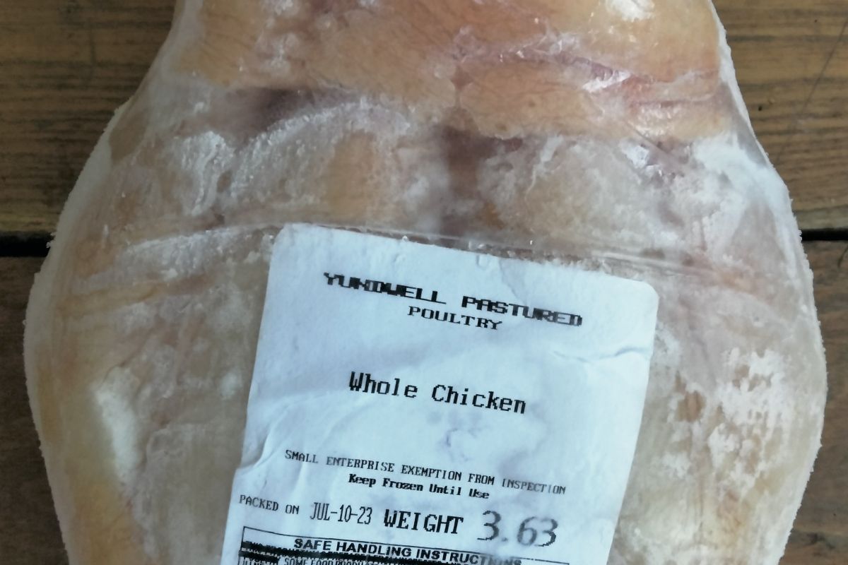 A whole chicken produced by Yundwell Pastured Poultry in Canaan, NY. Yundwell raises their poultry on pasture and practices rotational grazing. Yundwell chickens are raised according to the strictest production and humane treatment standards.