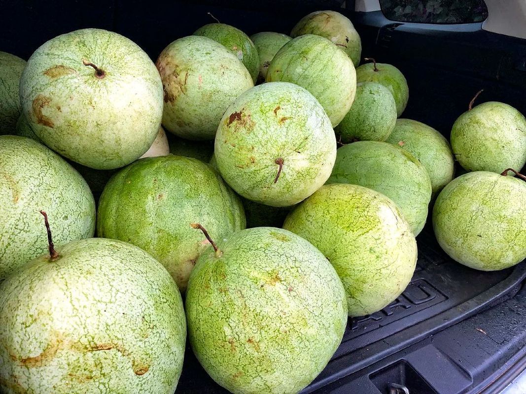 "Odell's Large White Watermelon fruits are gigantic with sweet, pink, juicy flesh, light green skin, and white seeds (though not very many). The rinds are tender, almost as sweet as the flesh, and great for pickling. While watermelons were first domesticated in Africa, this is one of few that are known to be a variety connected to a particular African American person, who in this case is an unnamed man who selected this variety during or before the 1840s on a plantation in Pomaria, SC. ... It is difficult to know when a watermelon is truly ripe. In Seed to Seed by Suzanne Ashworth, she recommends waiting until the small tendril opposite the melon's 'peduncle' (stem attachment) changes from green to brown and dries out. You can also look for color changes in the skin, and listen for a thud when the fruit is tapped."