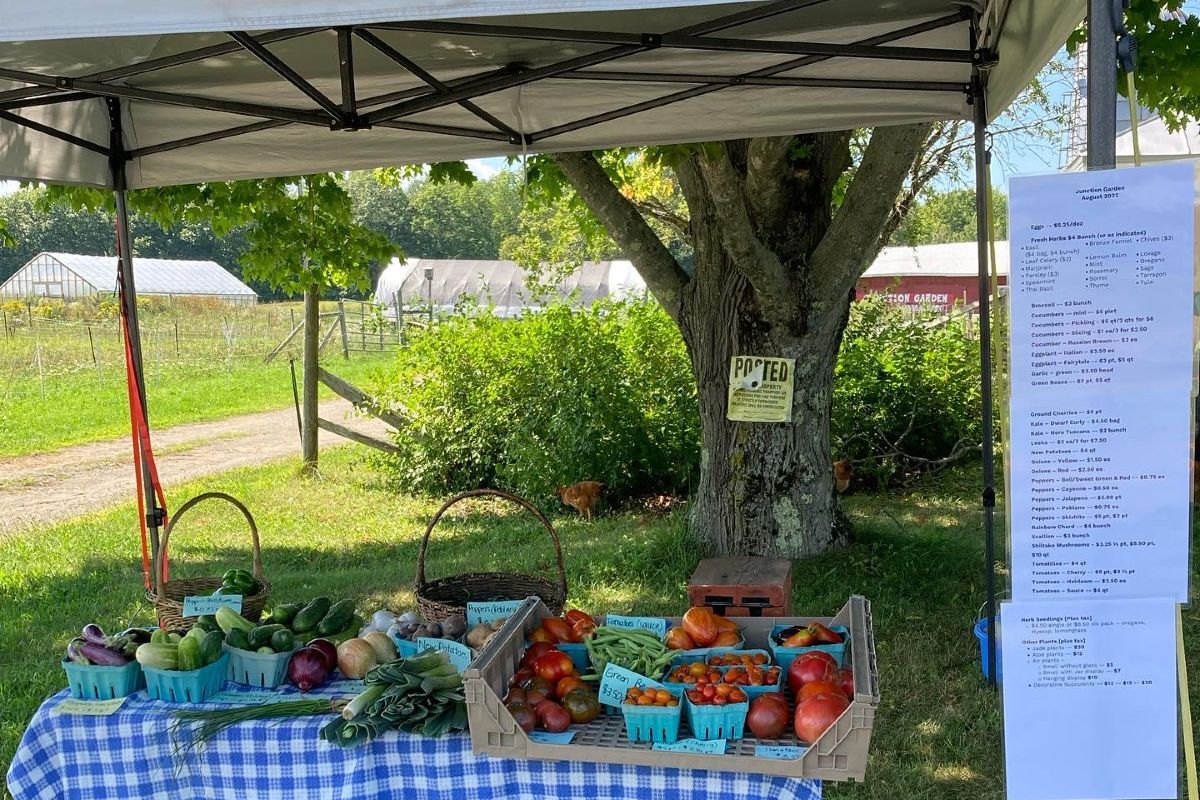 Hello! Eileen Flanagan and John Cochrane are the farmers at Junction Garden. We are a small-scale market farm using regenerative and organic farming practices. The farmstead is solar powered and geothermally heated. We are first generation farmers that have lived our lives caring for and respecting the land. We have 70 acres with hay fields, forest and gardens. We grow fruits, vegetables, log-grown Shiitake mushrooms, natural dye plants and keep laying hens, Muscovy ducks, Nigerian Dwarf goats and Icelandic & Finn Sheep. We value the relationships and connections we make through growing and selling food and plants to our community. We hope you enjoy the products you buy from us!