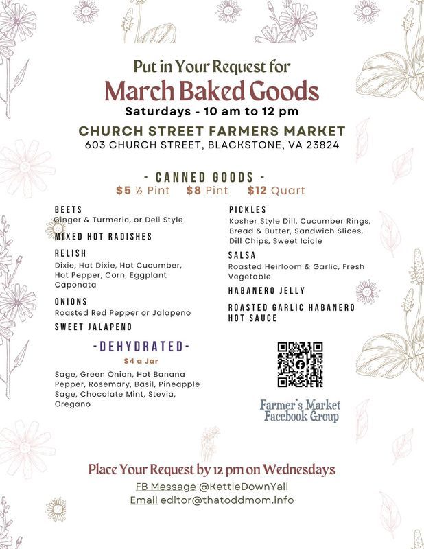 As a cottage kitchen, we offer our canned goods for purchase only at the farmers' market or directly from us at the farm. Currently Available at the Market - Kosher Style Dill - Cucumber Rings - Bread & Butter - Sandwich Slices - Dill Chips - Sweet Icicle - Pickled Onion w/roasted red pepper, or w/jalapeno - Sweet Pickled Jalapeno - Mixed Hot Radishes - Deli Style Beets or Ginger & Tumeric Spiced Beets Send us a message via Facebook at @KettleDownYall or text us at 434-264-4378 to submit requests.