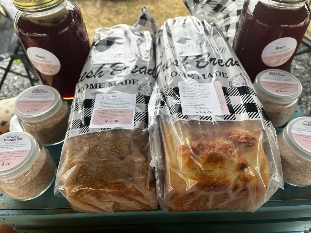 We are a small family farm in Nottoway County raising chickens and rabbits while producing perennial fruits and nuts, and some seasonal produce. As a cottage kitchen, we also offer a variety of pickles, relishes, salsas, and baked goods for direct farm pickup at the farmers' market. While you can view our options here, they are available for purchase in person only. Check our Facebook page for weekly availability or text (434) 264-4378 to find out what cottage goods we currently have available.