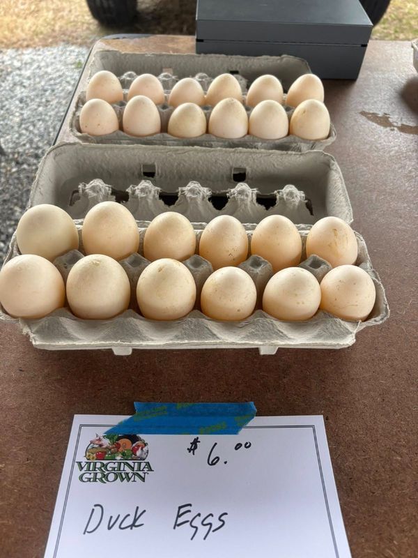 Available during market hours at Church Street Farmers Market, 603 Church Street, Blackstone, VA. 10 AM until 12 PM Saturdays. One dozen duck eggs from Mark.