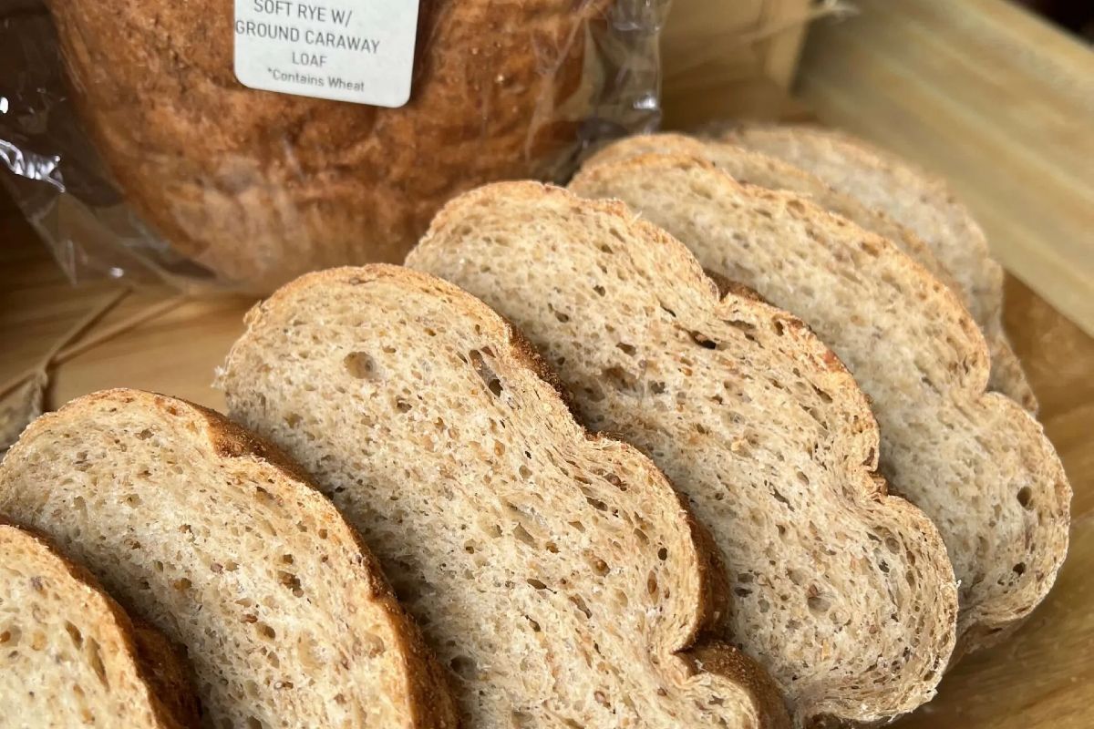 The Soft Rye with ground caraway is a new favorite to many. Whole Organic Rye is mixed with Thorpe's yellow potatoes, pastured rendered lard, and organic bread flour to get the perfect mix of flavor and softness. The caraway seeds are ground to not impede the soft texture. This soft loaf, like the other soft loaves, is great for “bread and butter” or deli sandwiches. It comes in a compostable wrapper, too. The loaves lasts longest when stored in a sealed bag or container. If the bread is presumably going to last you more than a week, store in the refrigerator or slice it into the freezer off the bat. Enjoy 🙂