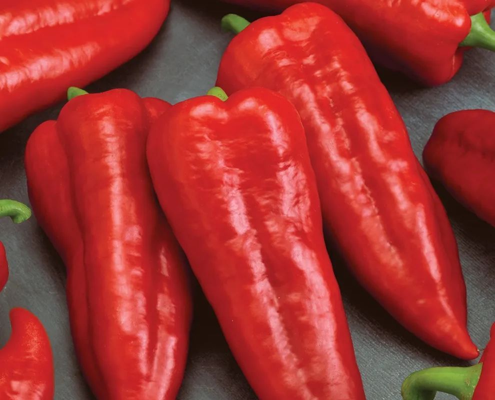 Sweet Pepper- Marconi Red - Thick-walled, sweet red fruits grow up to 12" long. Productive and delicious, a family favorite! Grown from our saved seed.