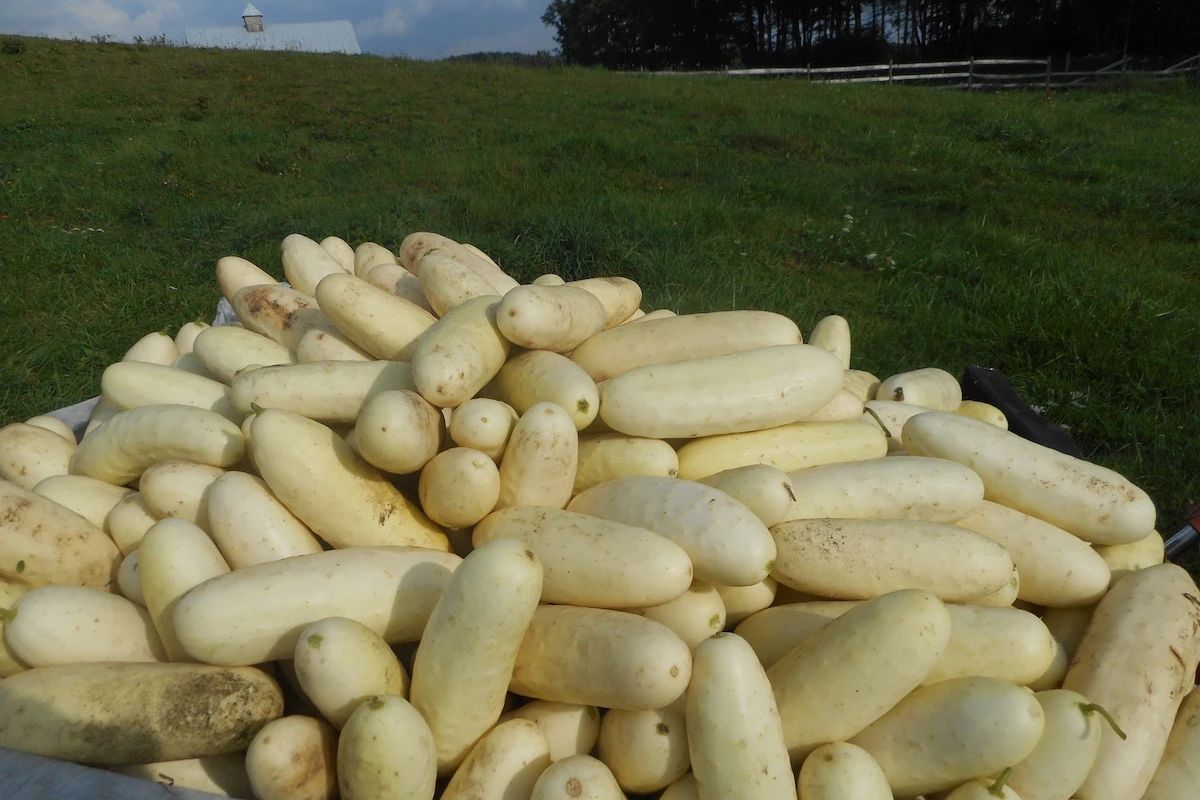 From Fedco: (64 days) Open-pollinated. Psst! We’d love to pass on a secret known to few: this superior Cornell University slicer may be the best eating cucumber of them all. Megan Rulli of Piney Mountain Orchard in Gardners, PA, calls Silver Slicer “the cucumber of my dreams.” Incorporates all of the good features of Boothby’s Blonde in a better package. Longer (7–8") and slimmer (fairly narrow 1" core) than Boothby’s with a creamy-white tender skin. Heavy set of buttery crunchy crisp fruits, neither watery nor ever bitter. Resists PM and keeps going till September.