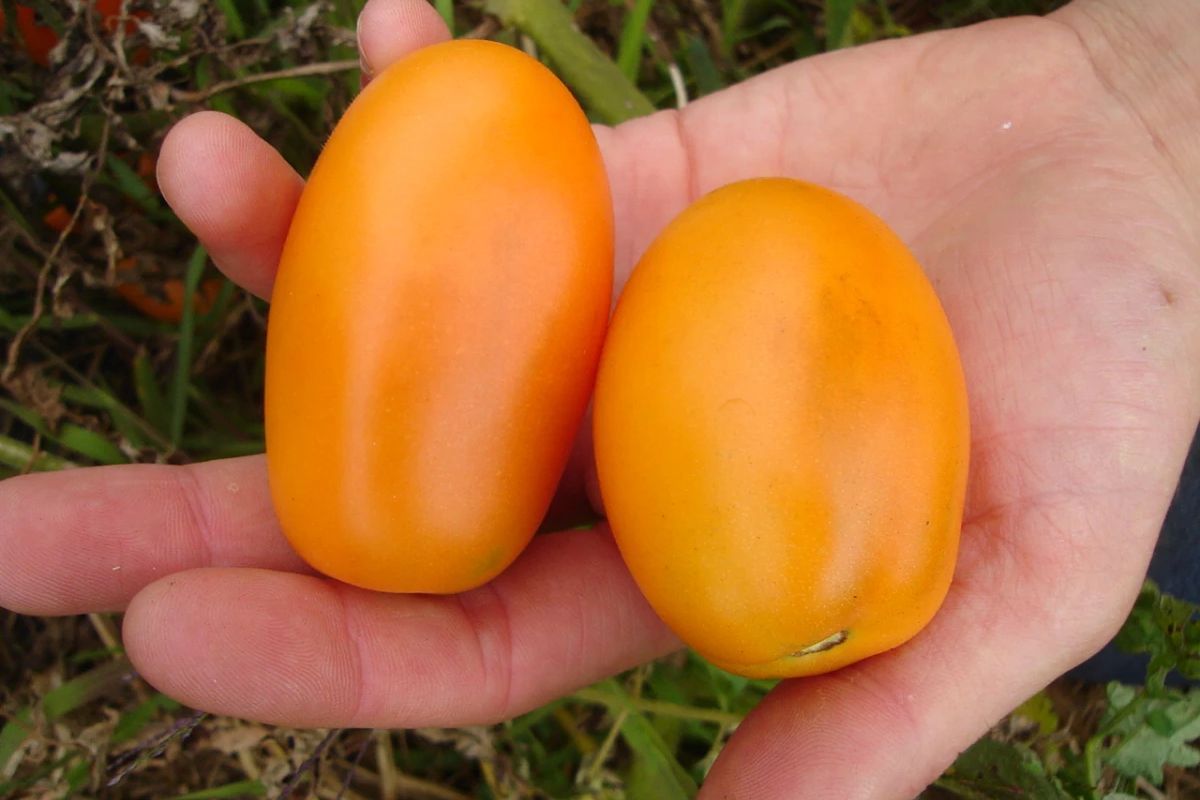 This tomato is the SAUCE! Perfect flavor and texture, with beautiful orange fruits on productive, disease-resistant plants. Outstanding cooking qualities and yummy for fresh eating. Don't let the color throw you; this is our favorite paste tomato. Saved seed, originally sourced from Fedco.