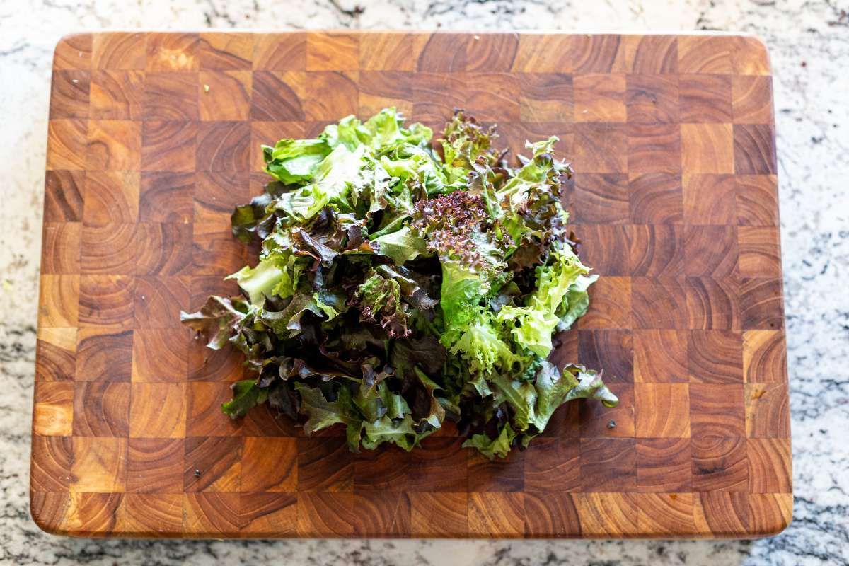 Mix of fresh cut lettuces, washed and packed. The mix only includes lettuces (no arugula, spinach, etc.) and features baby green leaf, red leaf, romaine, and bibb lettuces.