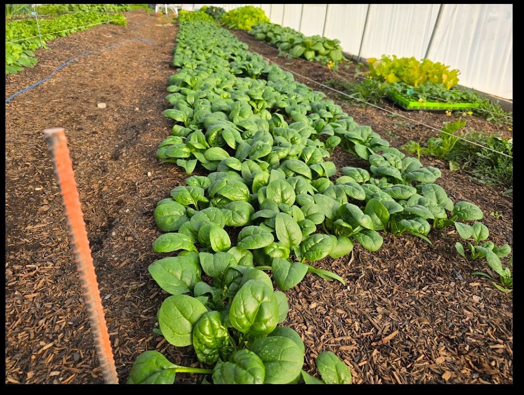 We enjoy a mix of angular arrow leaf and savoyed spinach leaves, ideal for both cooking and fresh in salads. Varieties of spinach will evolve throughout the season, with temperature changes.
