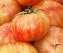 (85 days). Fruits reach 12 - 16 oz. Open-pollinated indeterminate. Unique large gold fruits with a blend of orange/red and green/red striping. Sweet, juicy flesh is swirled with color throughout. Stabilized by Jeff Dawson, this Green Zebra and Marvel Stripe cross is named for COPIA, the American Center of Food, Wine and the Arts in Napa, CA.