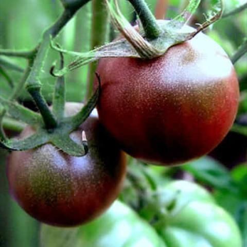(65 - 75 days). Open-pollinated indeterminate with exceptionally abundant growth. Beautiful black cherry tomatoes that look like large, dusky purple-brown grapes, 1 - 1.5 inches across; they have that rich, complex, and sweet flavor that makes black tomatoes famous.