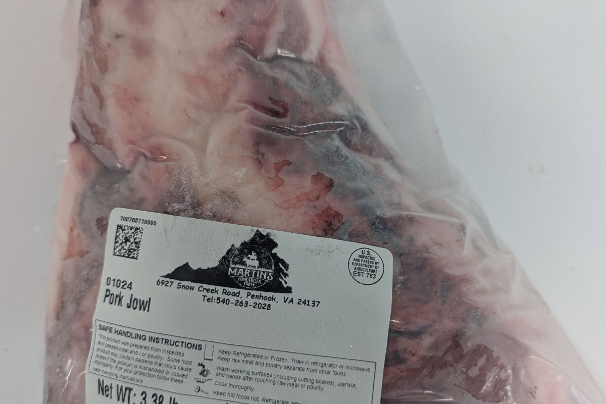 Hog jowls, also known as pork jowl, is a cut of pork taken from the cheek of a pig. It's a flavorful, fatty cut that's often cured or smoked and used in various dishes, similar to bacon or salt pork.
