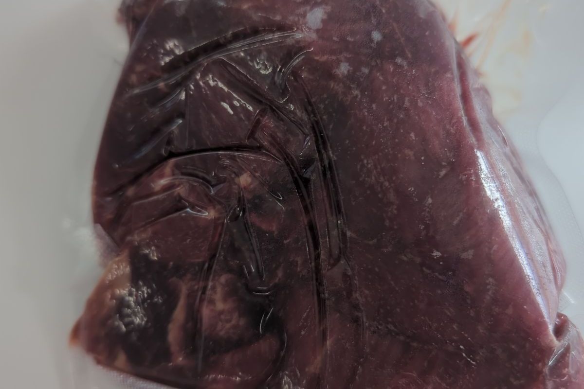 The beef tips cut in chunks.