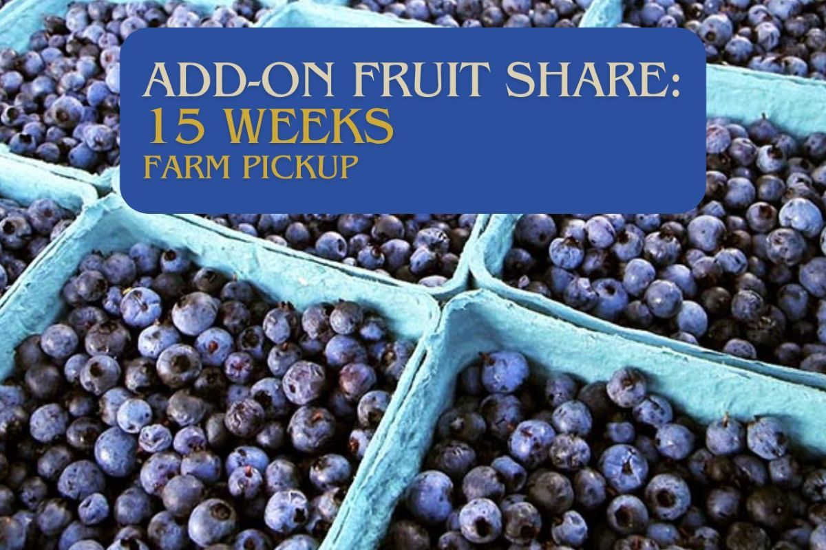 Begins in early July. Every week for 15 weeks you will get one type of fruit from High Hill Orchard. *Please note there is no half share option for fruit; this is a weekly pickup! Pickup examples: July: Blueberries (1 pint), or Peaches (2-2.5 lbs); August: Peaches or Plums (2-2.5 lbs), Melons (3-4 lbs), or Apples (3-4 lbs) September and October: Paw Paws (1-2 lbs), Apples or Pears (3-4 lbs), or Apple Cider (1/2 gallon) Pickup on your choice of Tuesdays 2:30-6:30pm, or Fridays 12:30-5:30pm. You can switch your pickup day during the season if needed, please give us one week notice.