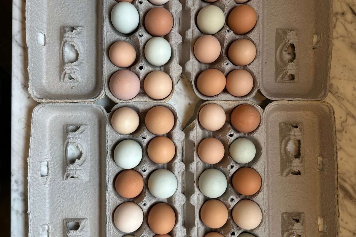 Eggs from our chickens, whom are free to graze on our property. They get a healthy diet of Organic, Non-GMO, Corn free, and Soy free feed. Mostly brown or blue. They are clean and in new cartons made of recycle paper pulp.