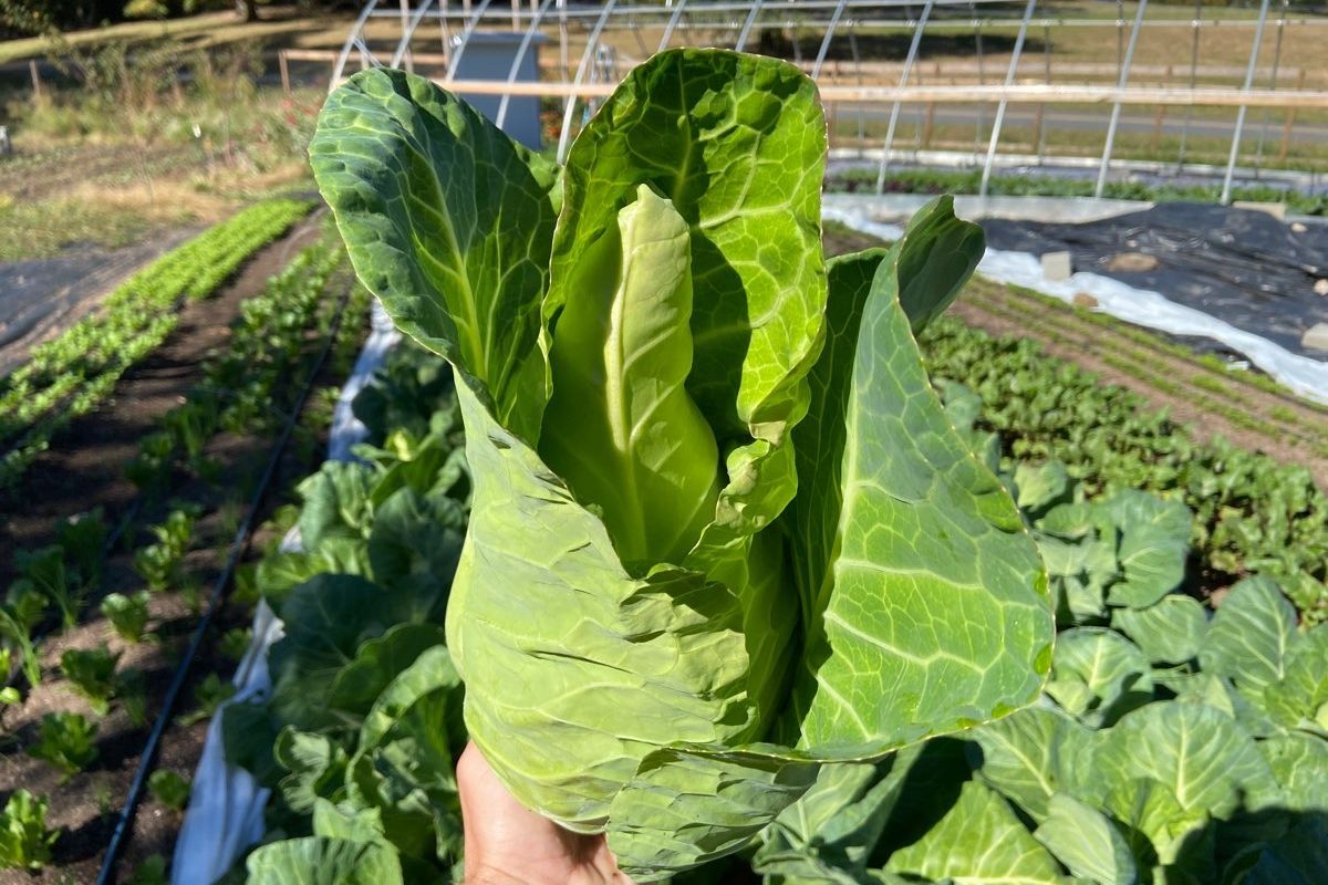 3-5lb heads. Conehead cabbage’s flavor beats other cabbage’s flavor hands down! Inner leaves are tender, crunchy, and have an excellent, sweet, mild cabbage flavor. We usually cook the outside leaves along with the rest, though the outside leaves are also great for wraps! Perfect for summer salads, slaws, or cooked dishes. We often just saute the whole cabbage for a quick side.