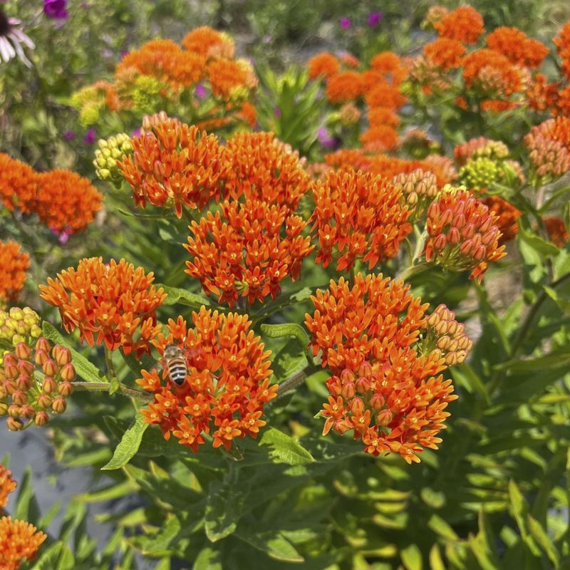 Pint size pot. Native perennial. Butterfly Milkweed, and any type of milkweed, is a must for a native garden! It is adorned with showy clusters of bright orange flowers from June to August. All milkweeds, including Butterfly Milkweed, are the sole host for the beautiful and endangered Monarch butterfly, whose numbers have declined precipitously in the last 20 years. In an ideal location, a mature Butterfly Weed can become a very showy specimen, with multiple flowering stems spreading across a 2 to 3 foot high plant. This rugged species thrives in sunny locations, and in dry soil.