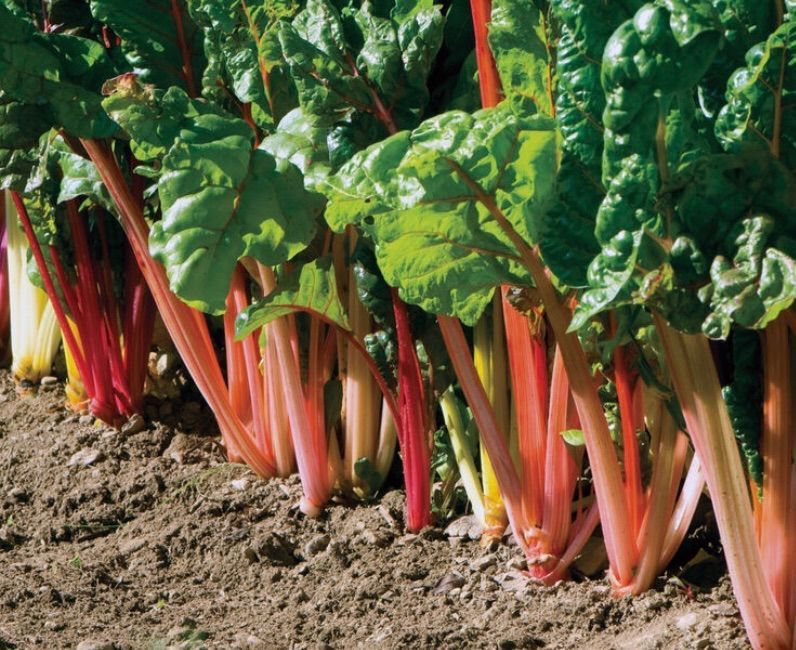 Description: Standard for mixed-colored chard with hues of pink, yellow, white, orange and red. Leaves can be trimmed off when you need them and the smaller, center ones will continue to grow.