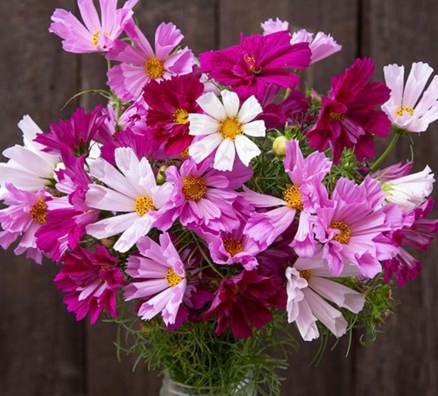 Description: Flowers range from pale white, pastel pink and dark pink. Cosmos will continue to bloom into the fall if plants are trimmed/dead-headed through season.