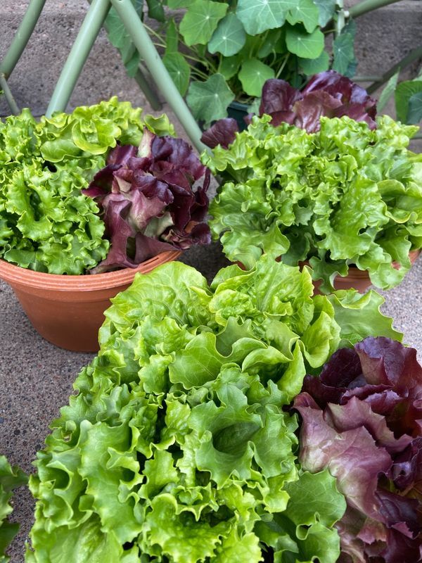 Description: 10" terracotta colored porch pot with three different types of lettuce. You can either pluck off the larger outside leaves of the lettuce heads as you need them and let the plants keep growing or wait for all of them to form a large head to harvest fully.