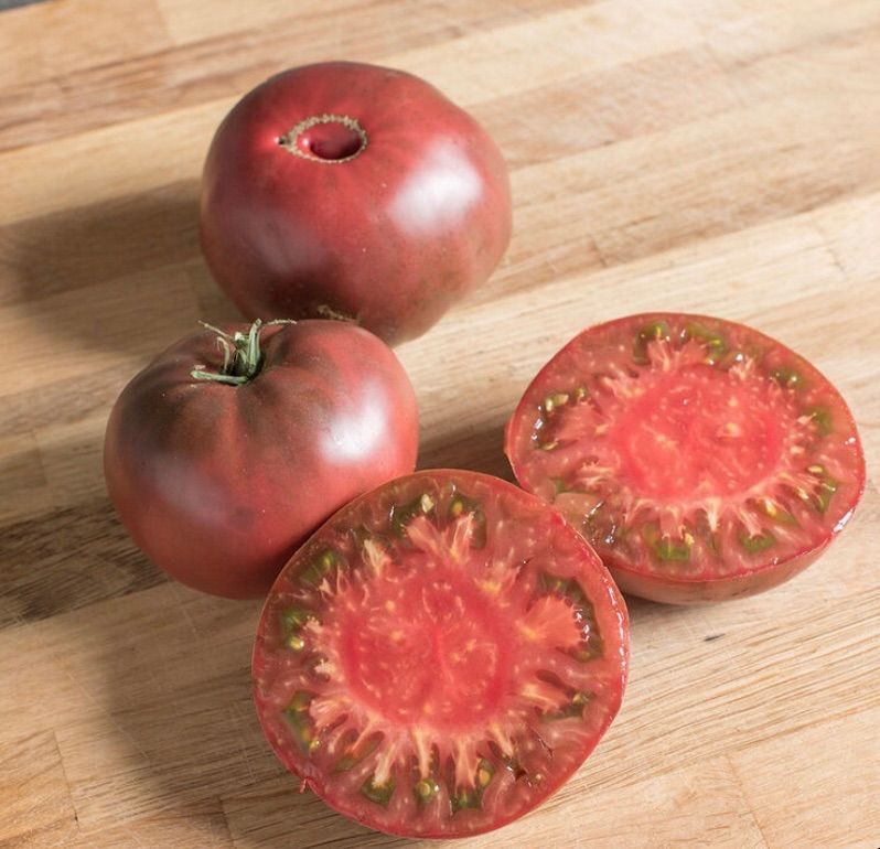 Description: Purple heirloom with 8-12 oz globe fruit. Dusty pink with darker shoulders. Indeterminate (will keep vining and setting fruit all season).