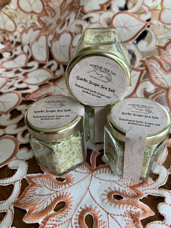 We dehydrate our organic garlic scapes and mix them with Sicilian Sea Salt to create a scape salt to be used in cooking as well as on raw veggies for snacking. A 1.5oz Hex glass jar perfect for hostess and holiday gifts!