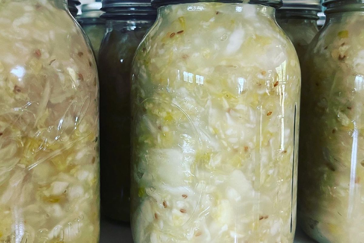 Grown and fermented in traditional crocks on the farm using only farm grown ingredients (except for the salt) including cabbage, onion, garlic, and dill. This is simply the tastiest, crunchiest, healthiest Kraut. We love to eat it right out of the jar, or added to just about anything. These products are homemade and not subject to state inspection.