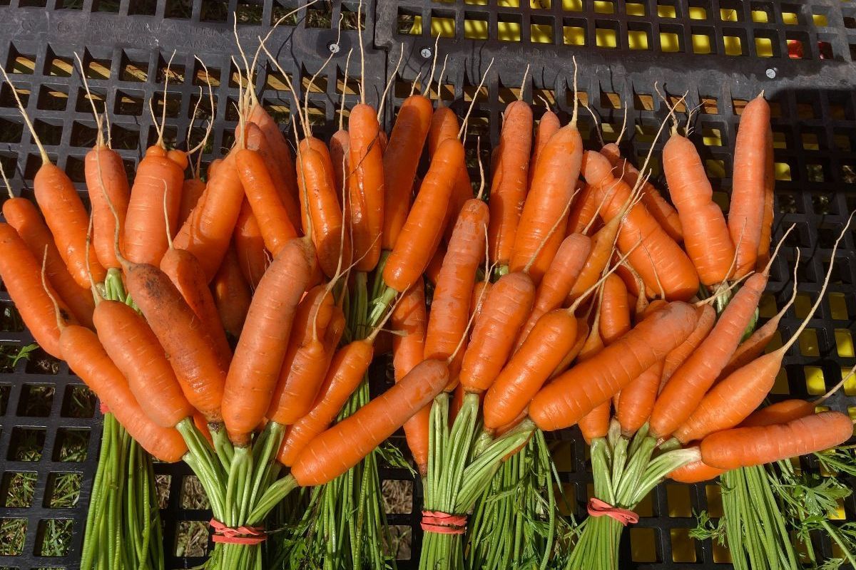Mixed varieties carrots - all orange. Bunched with green tops.