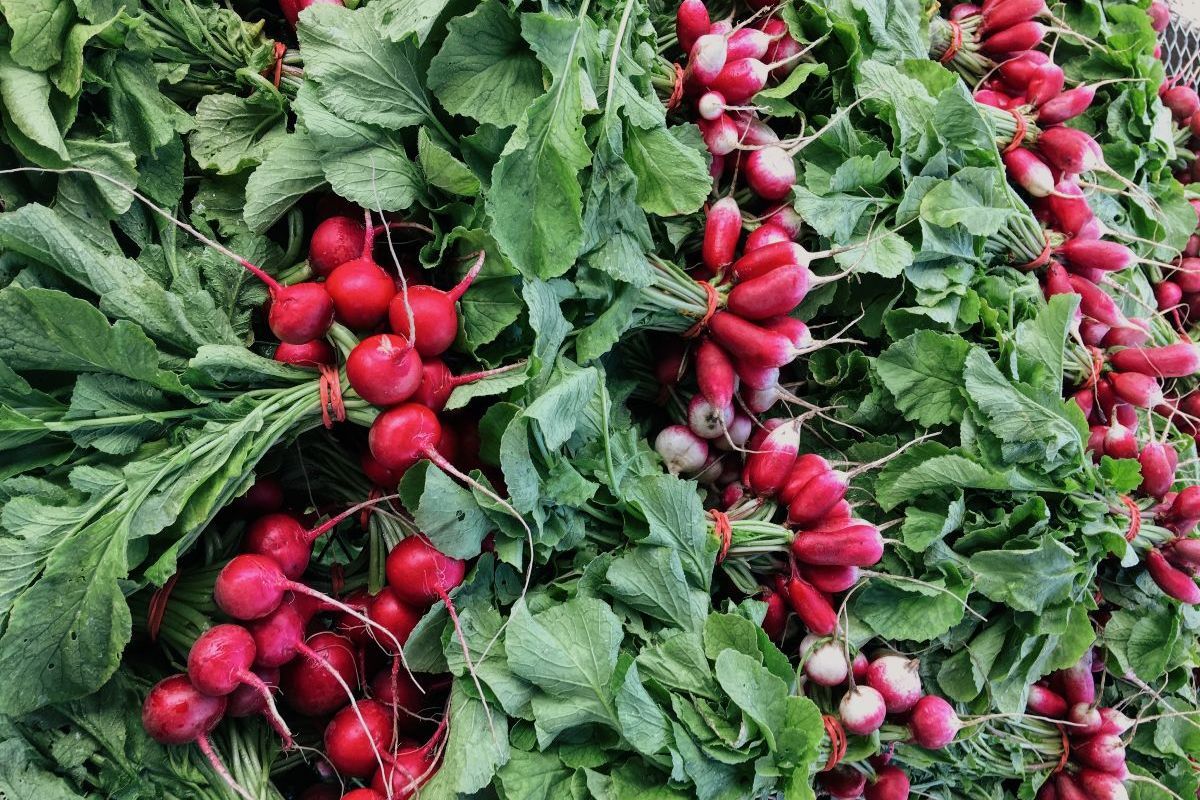 Bunched radishes. Varieties range from classic red round to french breakfast to purple and more.