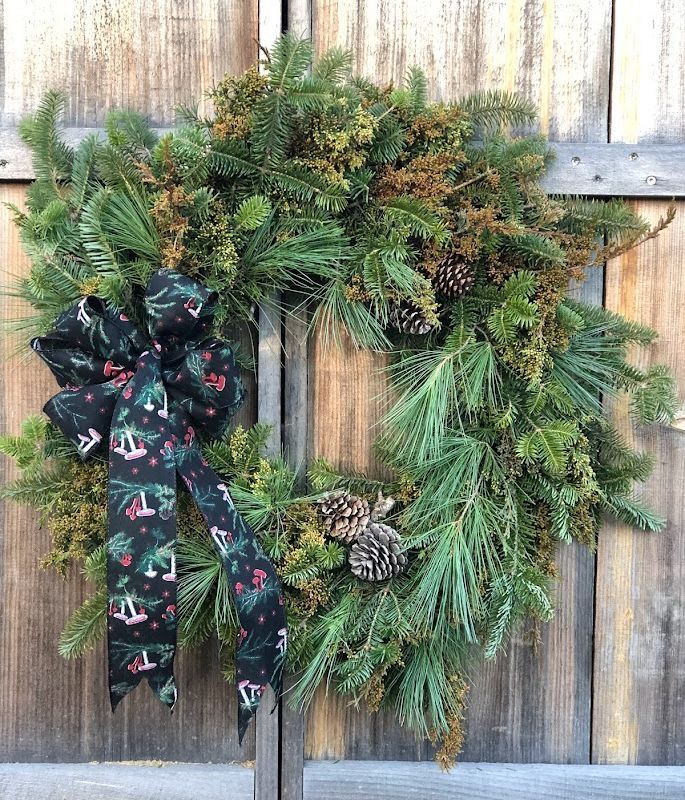 A large holiday wreath made with freshly foraged mixed evergreens. Decorated with a bow of your choice!