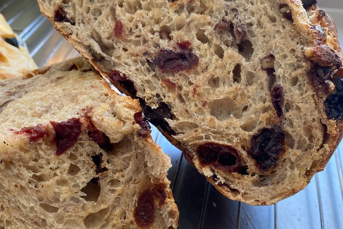 Ingredients: Bread Flour (wheat flour, malted barley flour, niacin, iron, thiamin mononitrate, riboflavin, folic acid), Hard Red Wheat Flour, Water, Sourdough Starter (wheat flour, malted barley flour, niacin, iron, thiamin mononitrate, riboflavin, folic acid, water), Salt, Pecans, Dried Cherries (cherries, sugar, sunflower oil)