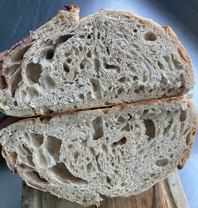 This is a larger loaf than our standard plain sourdough and is made with half whole wheat flour. Its still has a soft crumb, but is a little more hearty with a more robust flavor due to the increased whole wheat flour.