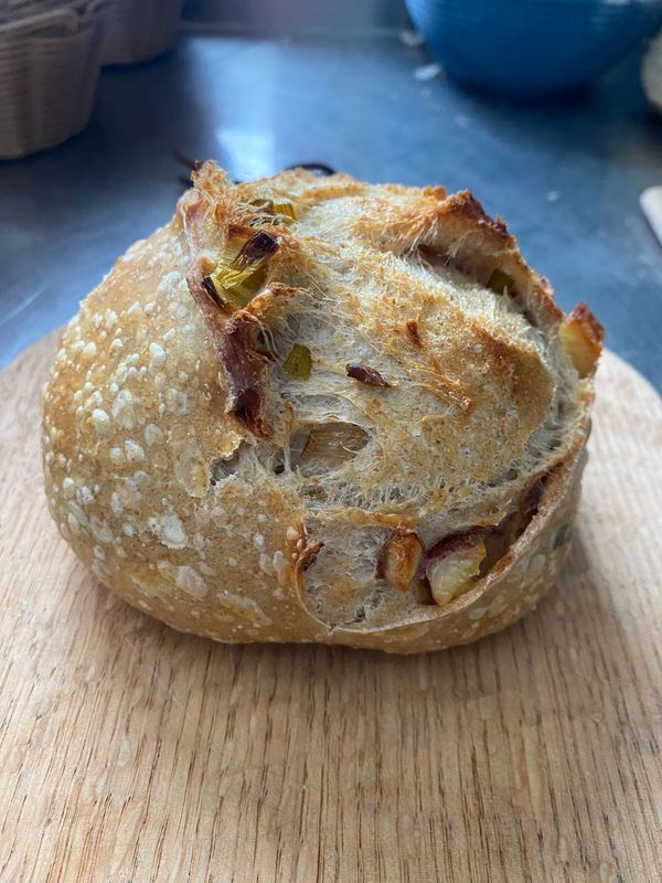 We are using redskin potatoes we grew plus a hint of farm grown rosemary and roasting them along side leeks (this summer we will have farm grown leeks)! We add this roasty mix to our standard plain sourdough loaf and you get a pillowy soft crumb with bursts of creamy potato and mild leek flavor.
