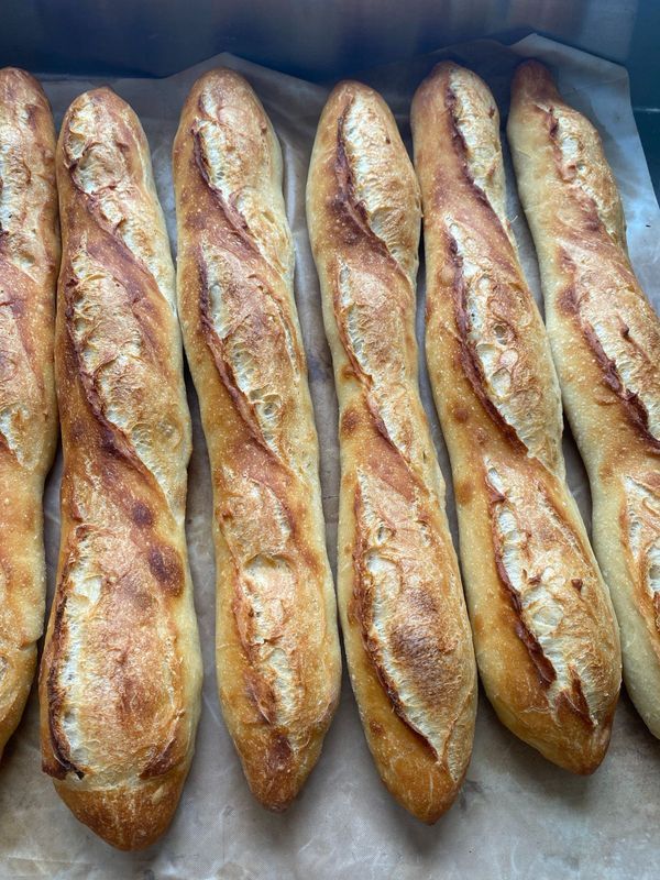 The Calumet baguette is our take on a classic French baguette. Baked to a dark golden brown, crispy and crackly with a soft crumb. It is best eaten the day of, but if you spritz it with water, wrap it in tinfoil and bake for 10-15 minutes, it will come back to life. This baguette is made with a poolish (commercial yeast) and not sourdough. It does include flour grown and milled by Heartland Craft Grains located in Lodi, WI.