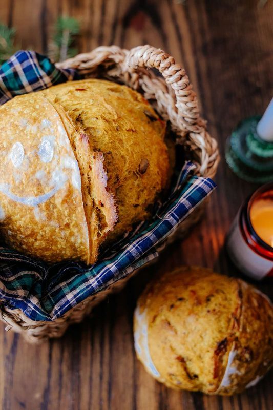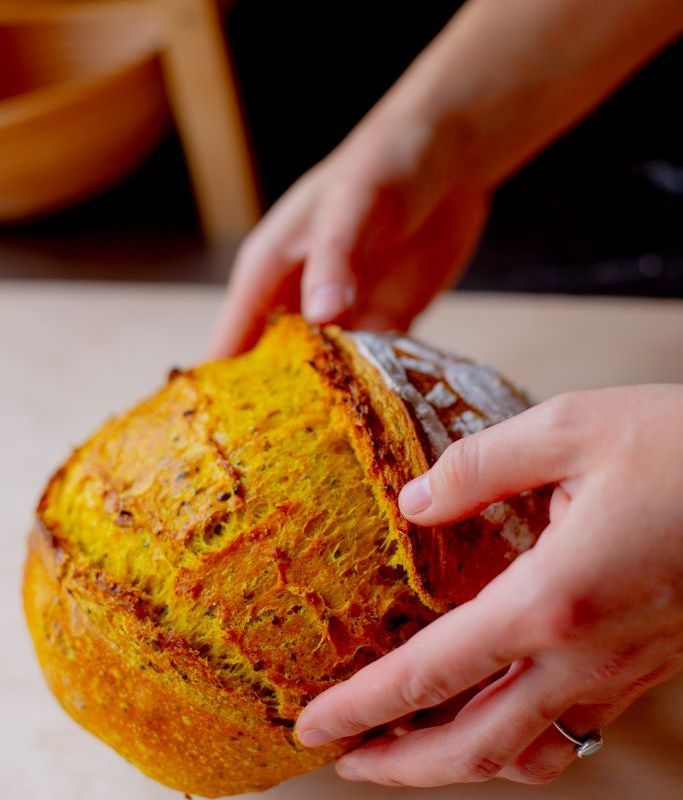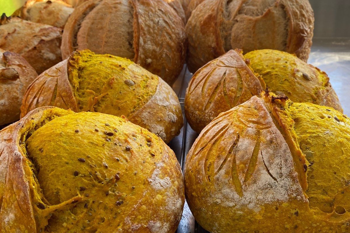 Ingredients: Bread Flour (wheat flour, malted barley flour, niacin, iron, thiamin mononitrate, riboflavin, folic acid), Hard red wheat flour, Water, Sourdough Starter (wheat flour, malted barley flour, niacin, iron, thiamin mononitrate, riboflavin, folic acid, water), Pumpkin seeds, Chia Seeds, Flax Seeds, Turmeric Powder, Sea Salt.