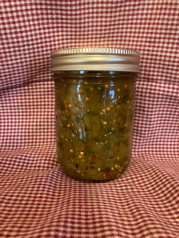 Delicious on whatever you add cucumber relish to: hamburgers, hot dogs, chicken sandwiches. Also, a nice addition to your charcuterie boards with crackers. Ingredients: zucchini, onions, peppers, sugar, vinegar, celery seed, mustard seed, black pepper, corn starch, salt, turmeric
