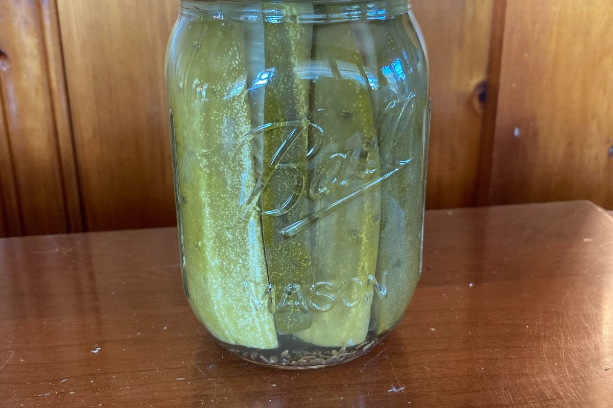 Ingredients- cucumbers, vinegar, water, salt, dill seed, and garlic