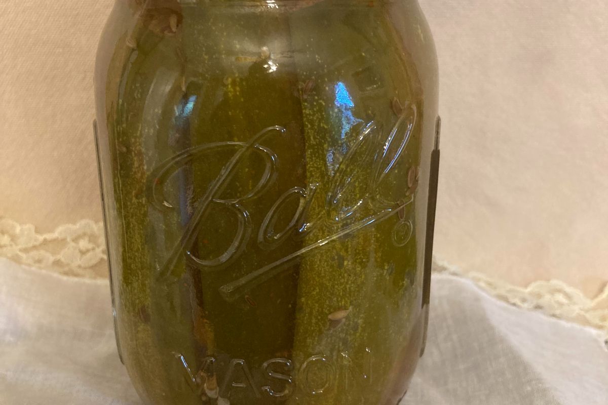 Ingredients- cucumbers, vinegar, water, salt, dill seed, garlic, and cayenne pepper
