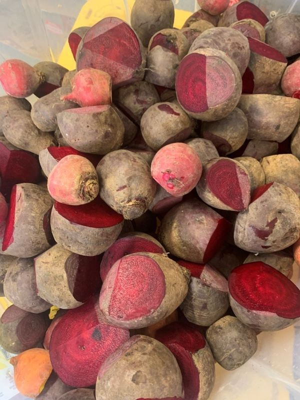 Beet seconds are those pieces that had a bad spot trimmed off or were ugly for some other reason. Uggos and chunks! Perfectly edible and delicious, and at a discount!
