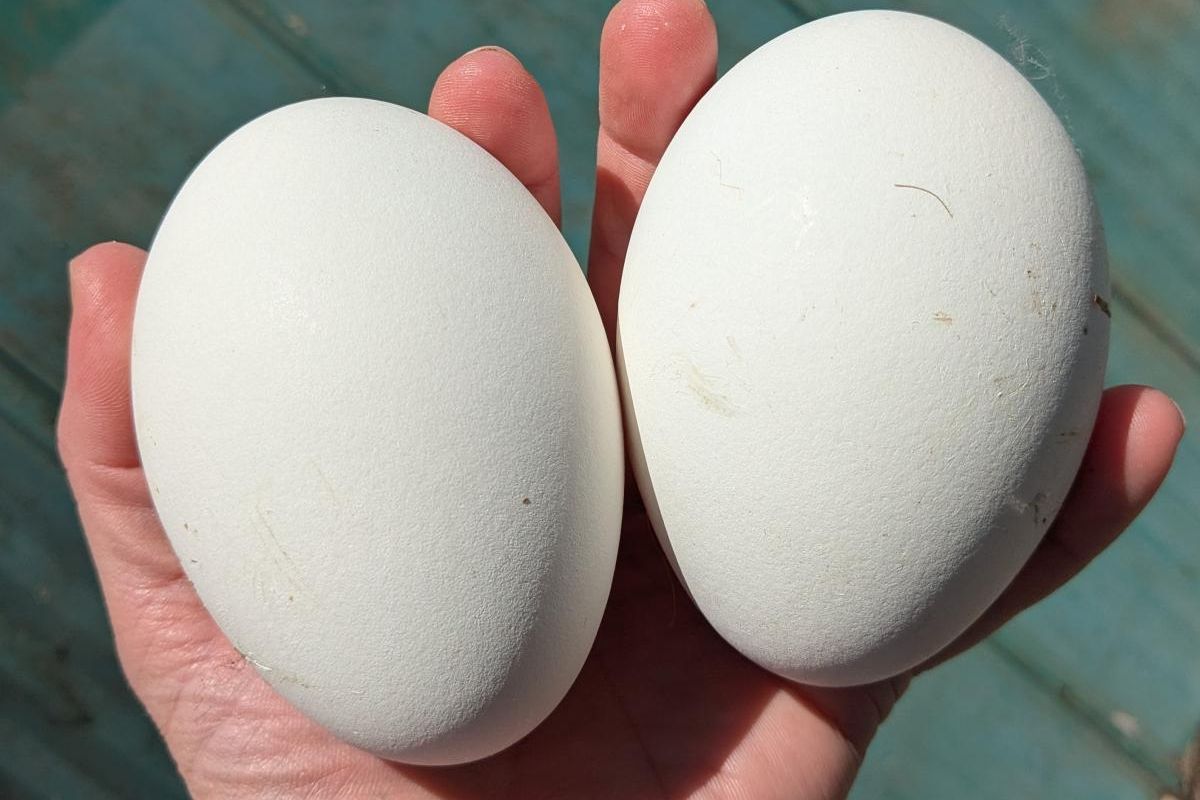 Goose eggs are about three times the size of chicken eggs. They are delicious and can be cooked in the same ways as hen eggs. With their richer flavour, they are great for omelettes and Spanish-style tortillas. The eggs have bigger yolks and less white than chicken eggs, which can lead to heavier, moister, denser baked goods. Chefs appreciate goose eggs for making pasta for the rich flavour and the more elastic texture, than hens eggs. Geese only lay about 40 eggs a year, which combined with their massive size, explains the price. The shells are much harder than chicken eggshells.